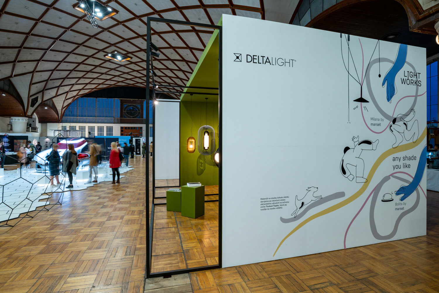 Krásnou expozicí obohatili letošní Designblok i spolešnosti Delta Light a Lightworks. Fotogenická zelená strana expozice si pohrála se stíny moderních svítidel a nutila tak nejednoho návštěvníka zastavit se a působivou stínohru pozorovat.