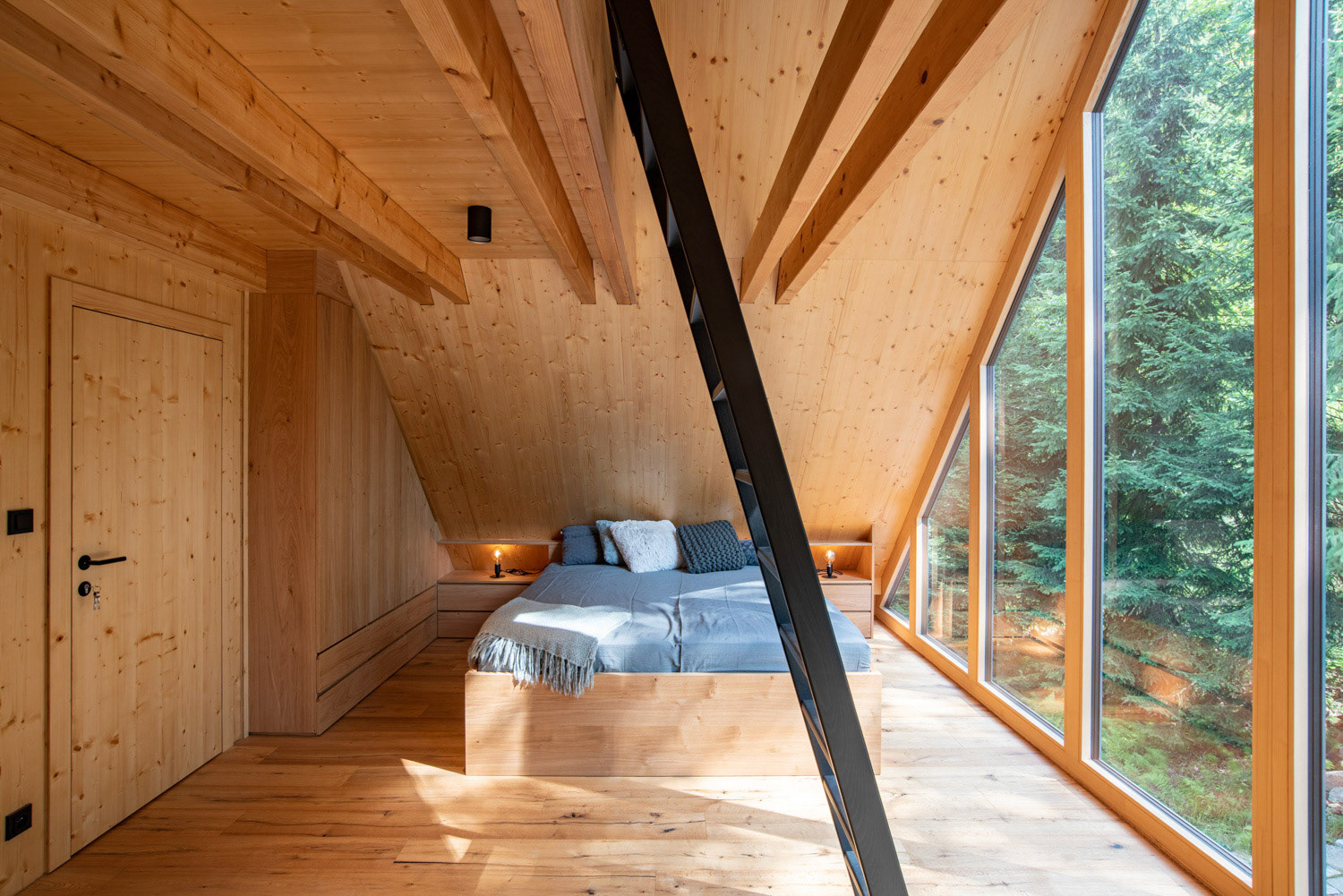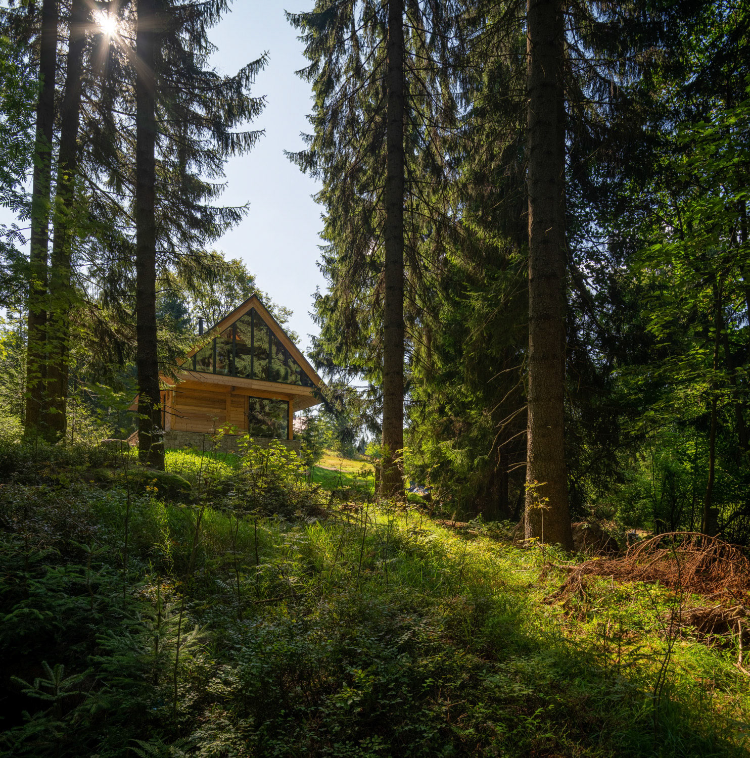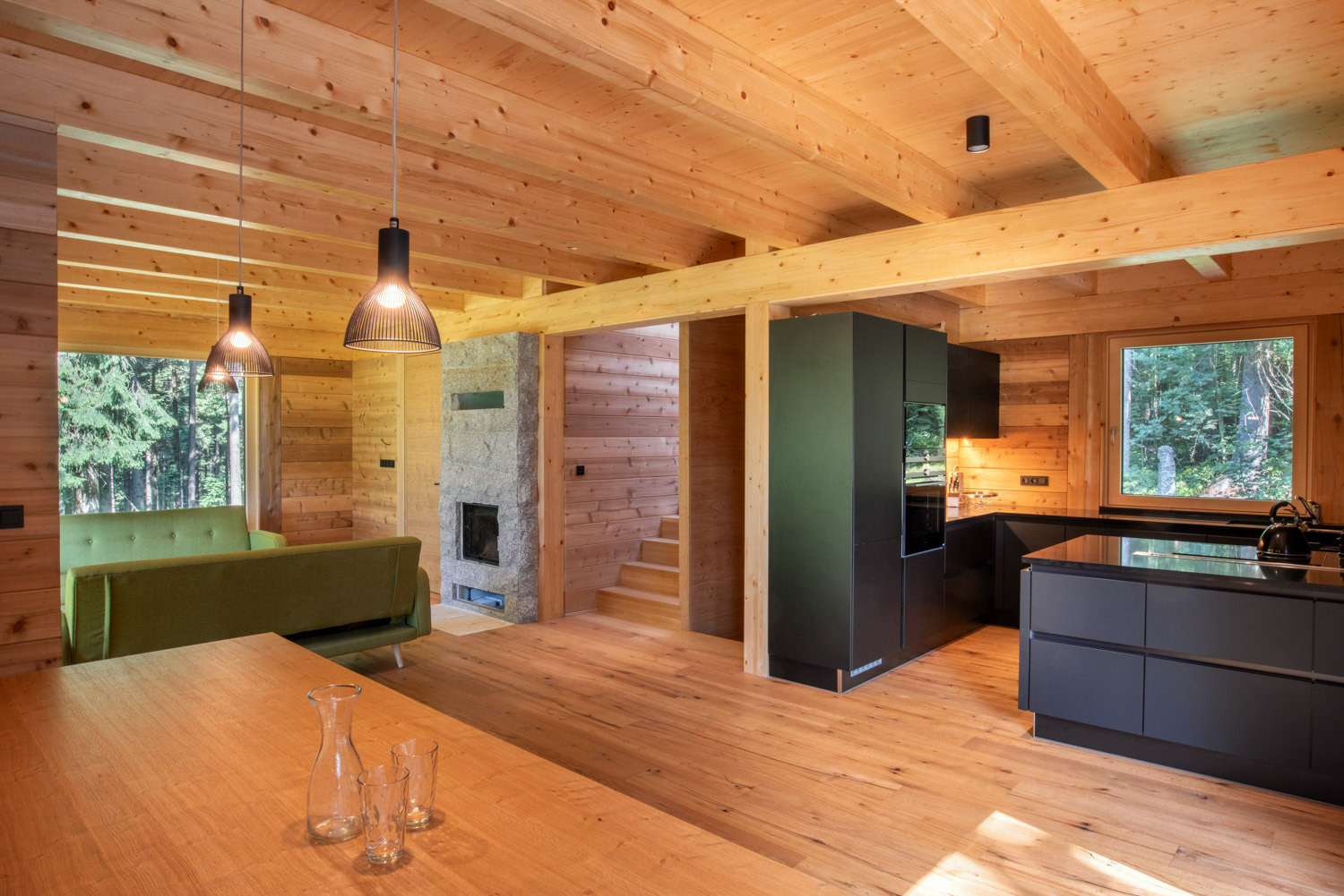 V krásném prostředí Krkonoší, skoro uprostřed lesa, s výhledem do korun stromů. Tak vypadá moderní dřevostavba, která zde slouží jako víkendové zázemí dvěma rodinám.